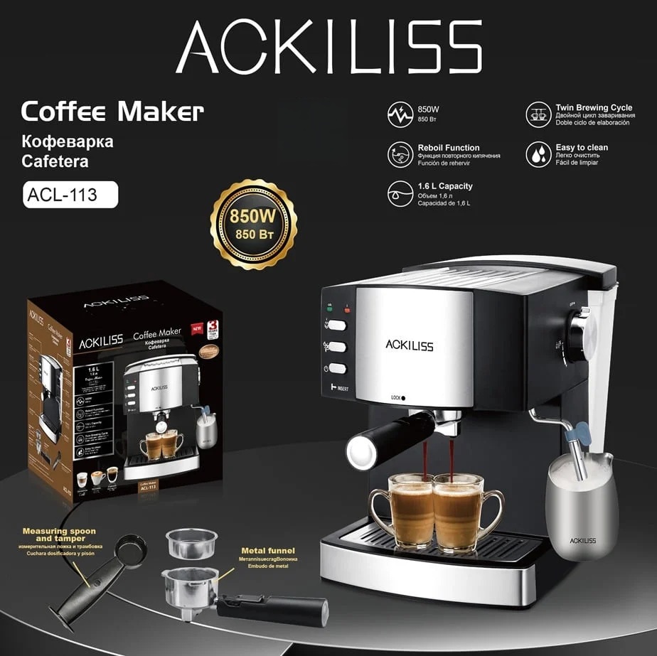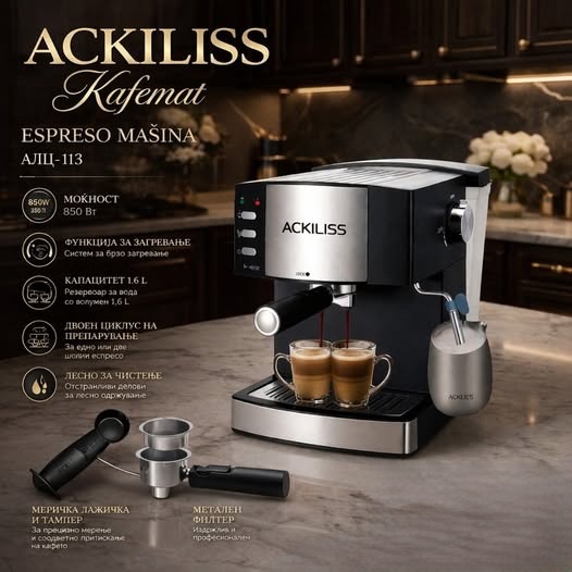 Доживејте вистинско кафе искуство во вашиот дом со елегантната и моќна еспресо машина ACKILISS. Совршен избор за љубителите на кафе кои бараат квалитет, стил и перформанси во едно.