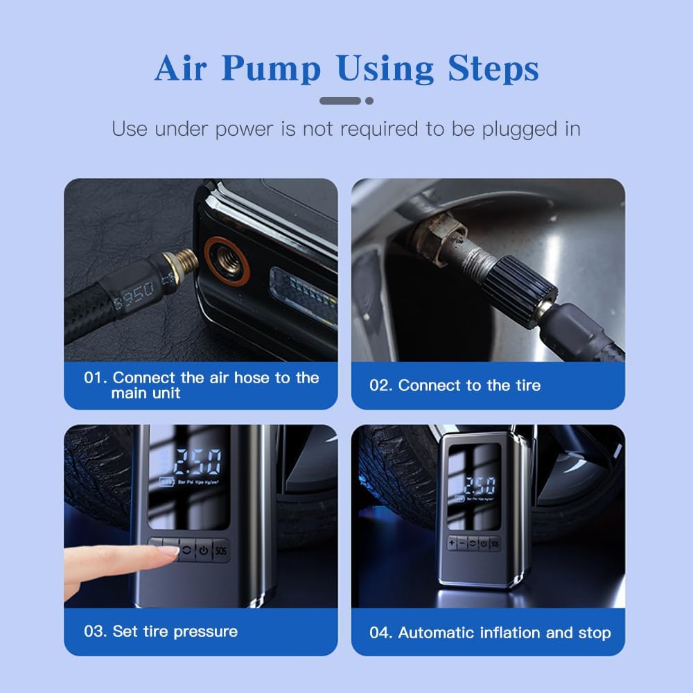 Оваа пренослива безжична пумпа ти овозможува брзо и лесно да ги надуваш гумите, без потреба да одиш на бензинска пумпа или гаража.