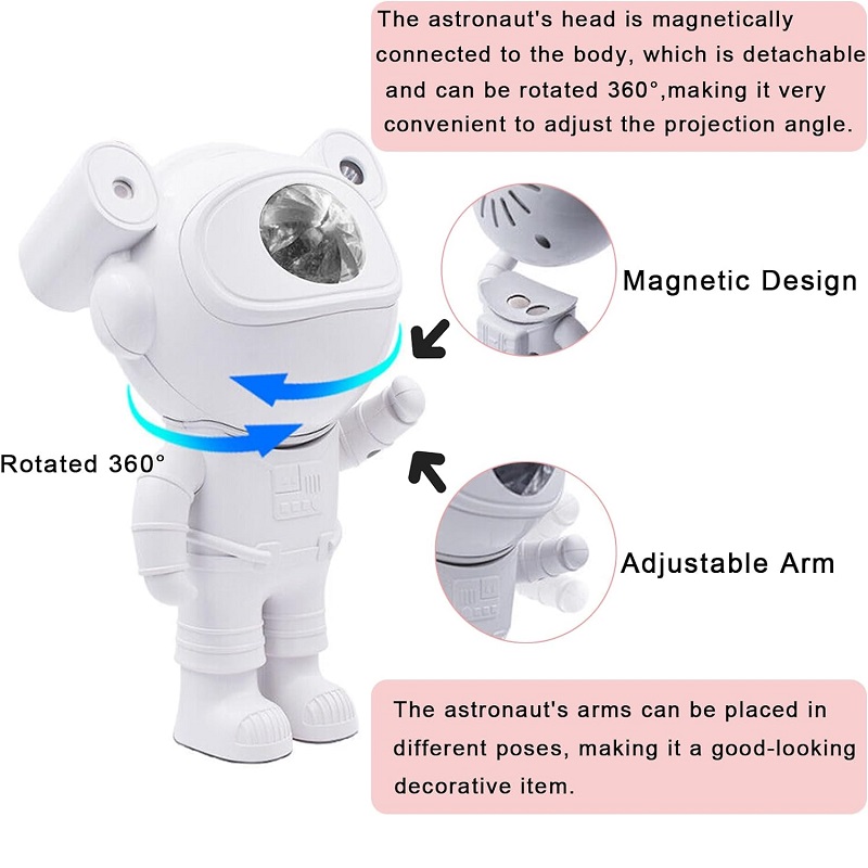 Има ротирачка рака за 360°, можете да ја изберете формата на астронаутот и аголот на проекцијата на ѕвезденото небо по желба.