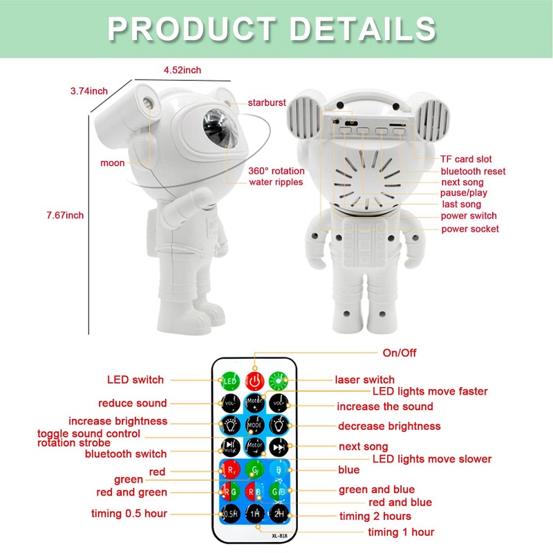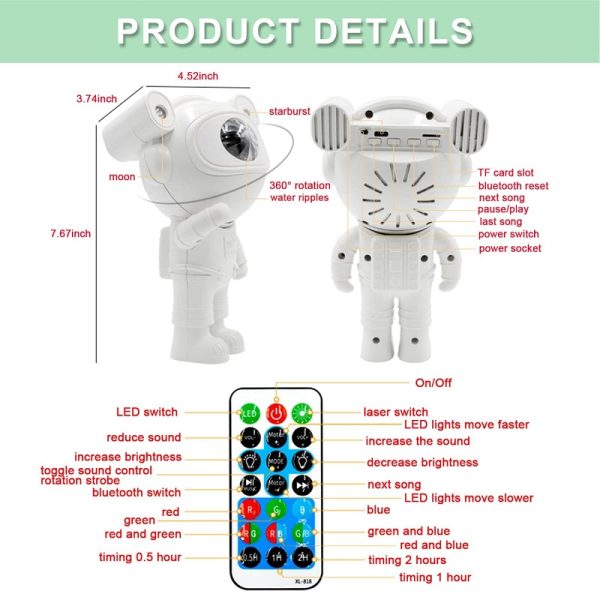 Проекторот на астронаутот ѕвезденото небо со далечински управувач, може да го контролира и префрла прекинувачот, да ја приспособи осветленоста и брзината на промената на маглината и ѕвездената светлина.