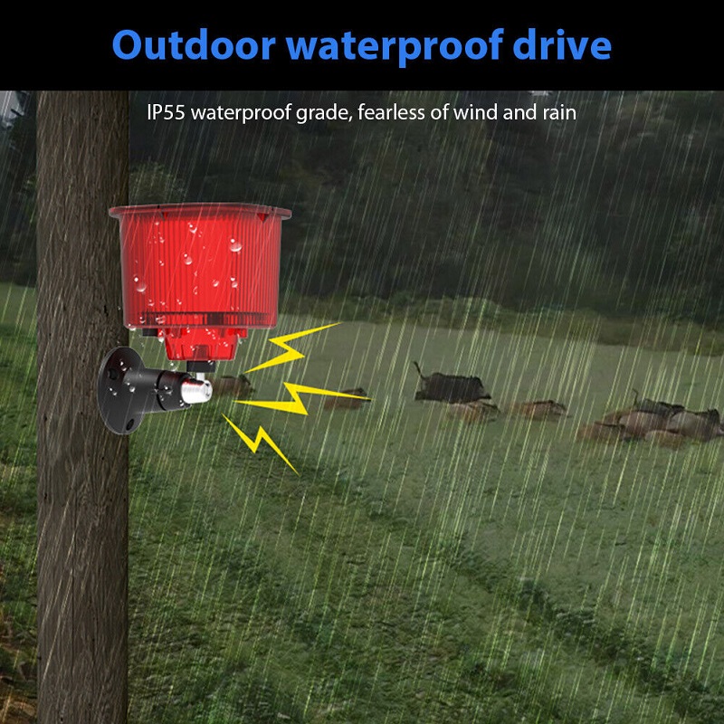 1. Овој соларен бркач на животни и птици има звучник со високи децибели и трепкачки светла, што може да помогне да се одвратат дивите животни од предизвикување штета на посевите, градините и другите надворешни простори.