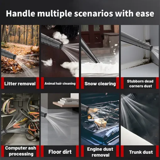 Моќен воздушен притисок – Генерира силен струјање што лесно ги отстранува листовите, прашината, остатоците и нечистотиите. Погодна и за надвор и за внатре.