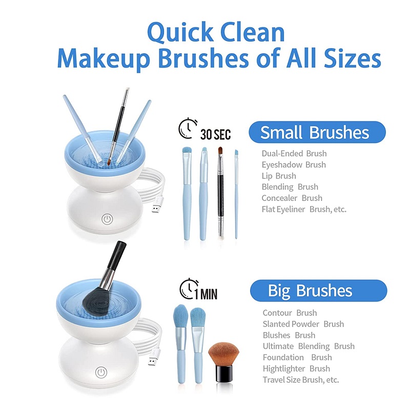 Оваа електрична алатка овозможува брзо и темелно чистење на четките за шминка. Вибрациите и ротацијата брзо ја отстрануваат шминката, нечистотијата и бактериите од четките, а со тоа им го продолжува животот.