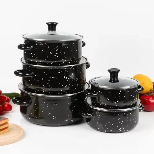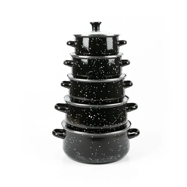 Емајлиран слој: Секој сад во комплетот има емајлирана обвивка која обезбедува рамномерна дистрибуција на топлина и спречува лепење на храната. Емајлираните површини го олеснуваат чистењето и одржувањето на садовите.