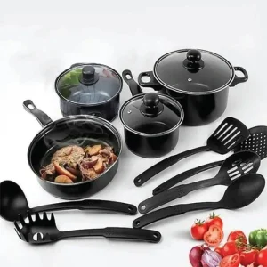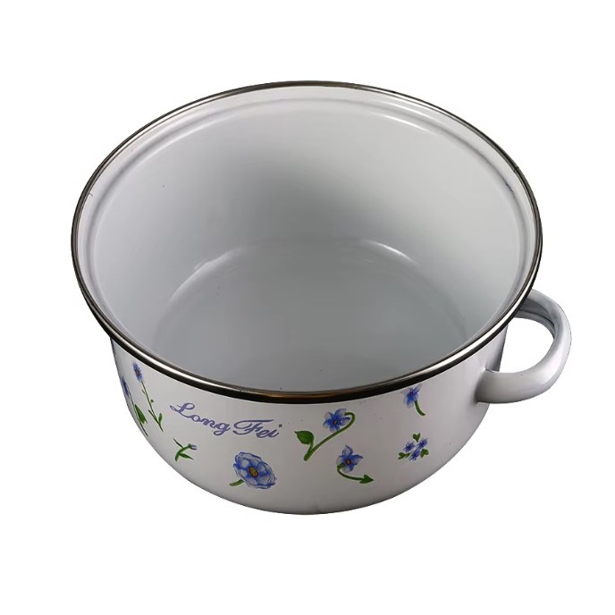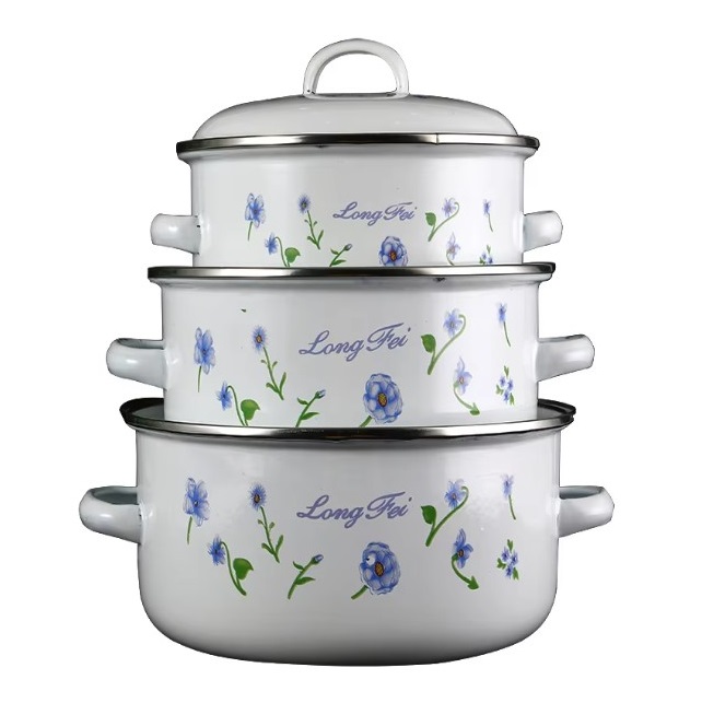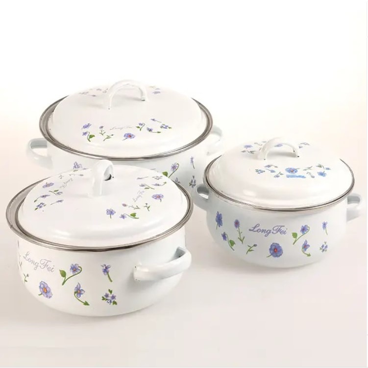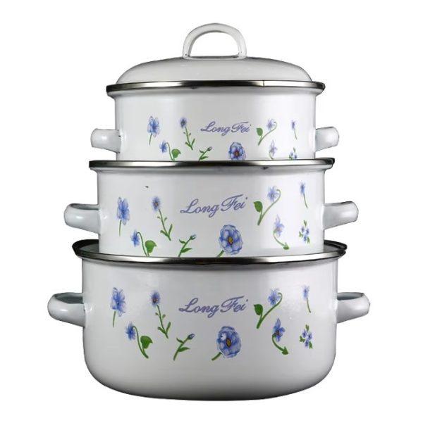 Емајлиран слој: Секој сад во комплетот има емајлирана обвивка која обезбедува рамномерна дистрибуција на топлина и спречува лепење на храната. Емајлираните површини го олеснуваат чистењето и одржувањето на садовите.