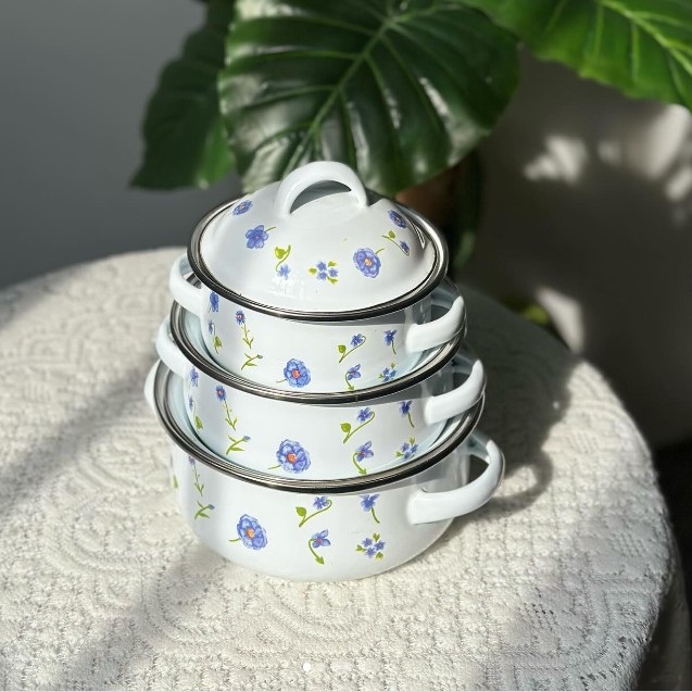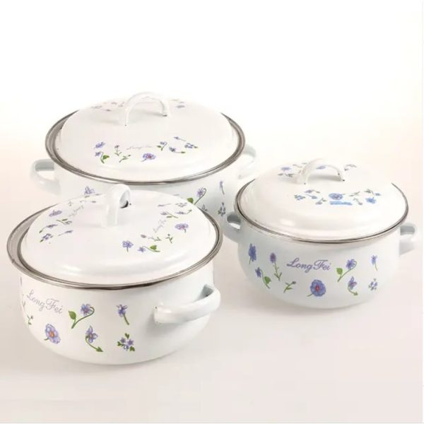 Овој прекрасен сет од 3 парчиња емајлирани садови со метални капаци е совршен додаток на вашата кујна. Комплетот доаѓа во комплетно бела боја со цветен дизајн, кој ќе додаде шарм и елеганција на вашето готвење.