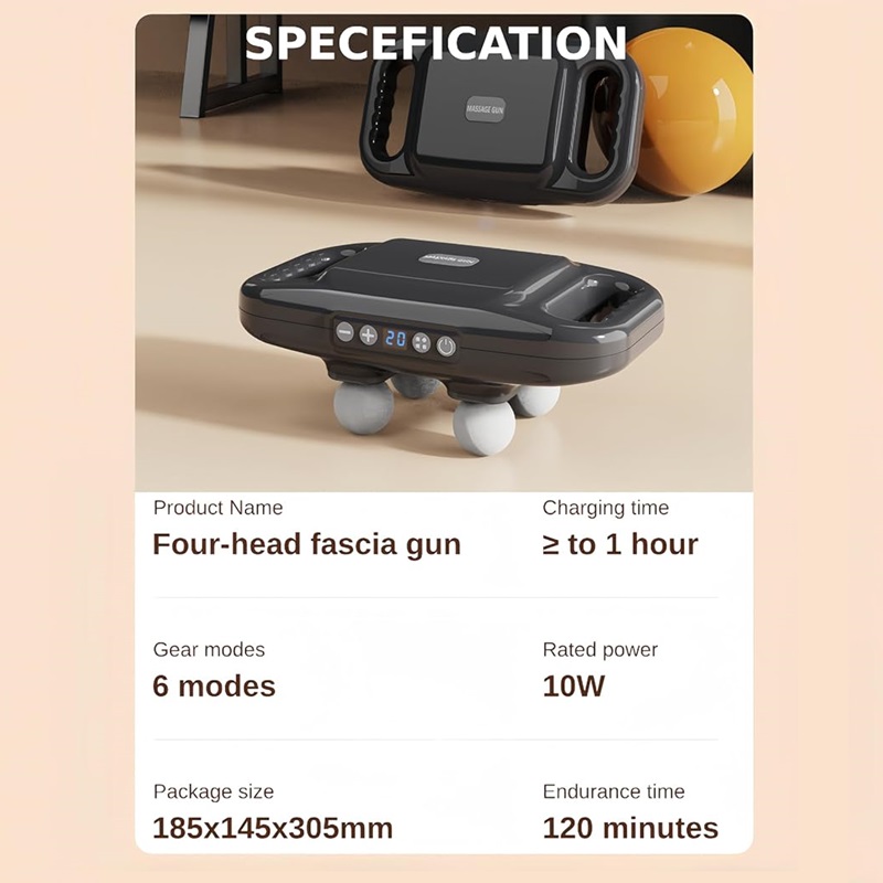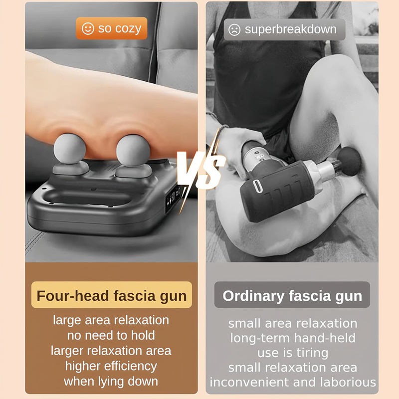 Четирите глави на пиштолот за масажа работат синергистички за да ги распрснуваат вибрациите низ поголема површина на покривање од традиционалните пиштоли за масажа со една глава. Може брзо да ви помогне да го ослободите стресот, заморот, недостатокот на сон и болката во мускулите, обезбедувајќи длабоко релаксирачко искуство. Може да се користи на вратот, грбот, рамената, нозете, рацете и рацете.