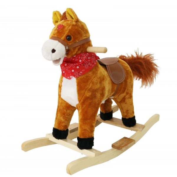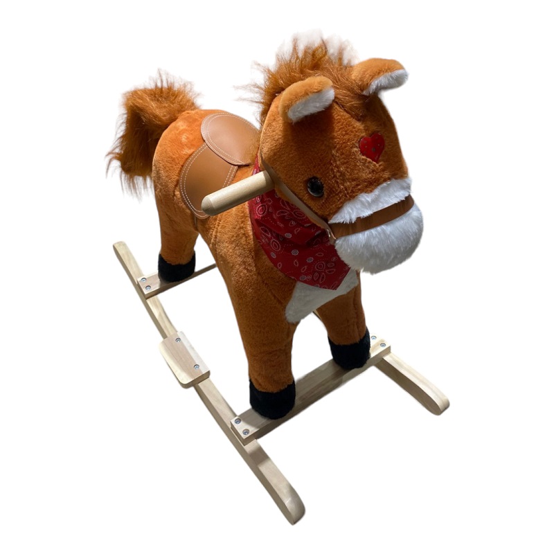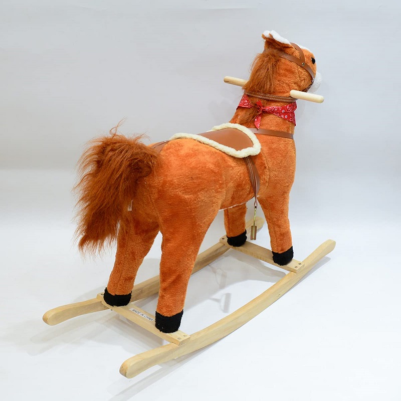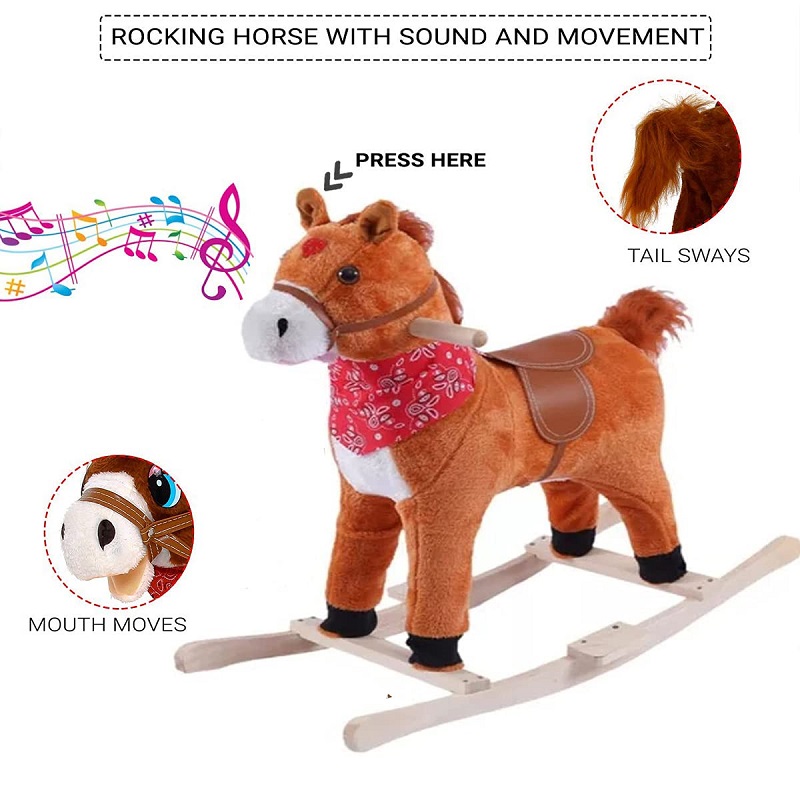 При пристискање на ушињата испушта звук на пријатна мелодија, коњчето зборува и мрда со опашот.