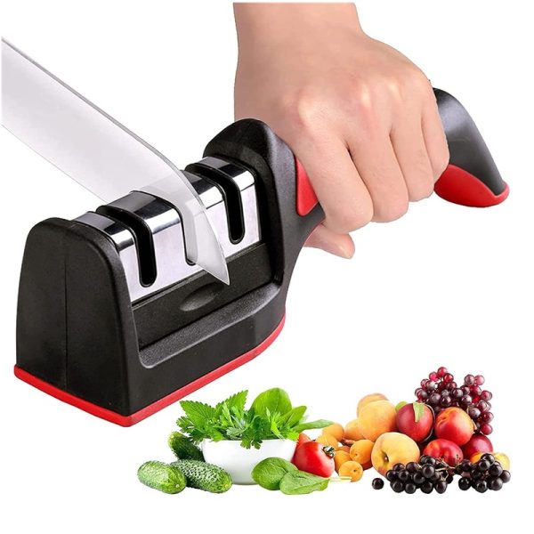 Ергономски дизајн, без разлика дали сте левак или деснак, може да се користи лесно, целосно без напор. можете да ги вратите вашите ножеви за готвење за неколку секунди! Едноставно ставете го сечилото во секој од отворите и нежно повлечете го ножот неколку пати за брзо и ефективно острење.