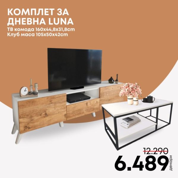 Комплет за дневна соба, составен од ТВ комода изработена од квалитетна иверица со дебелина од 18 mm и клуб маса со метална конструкција.