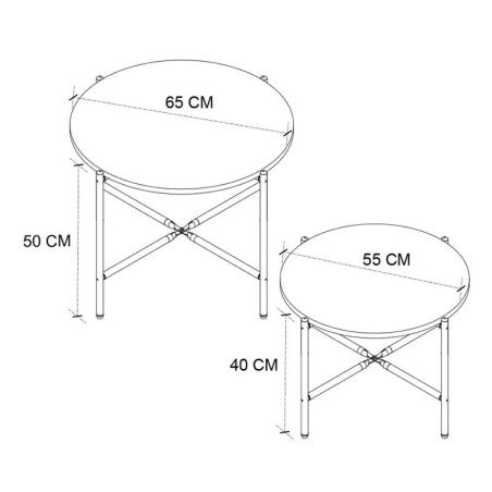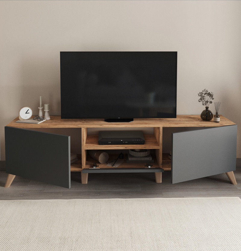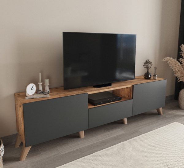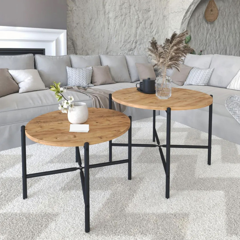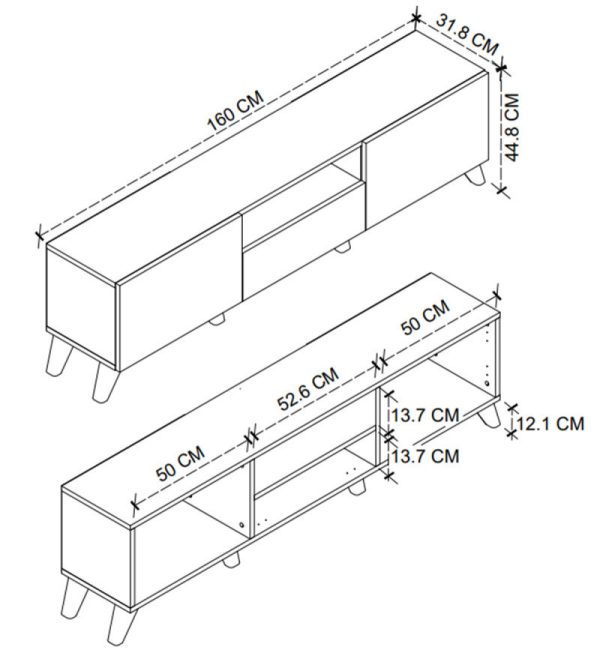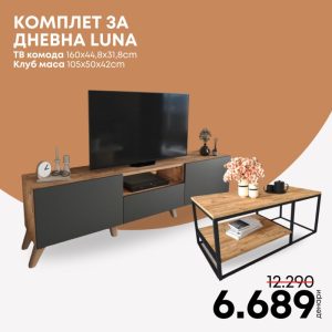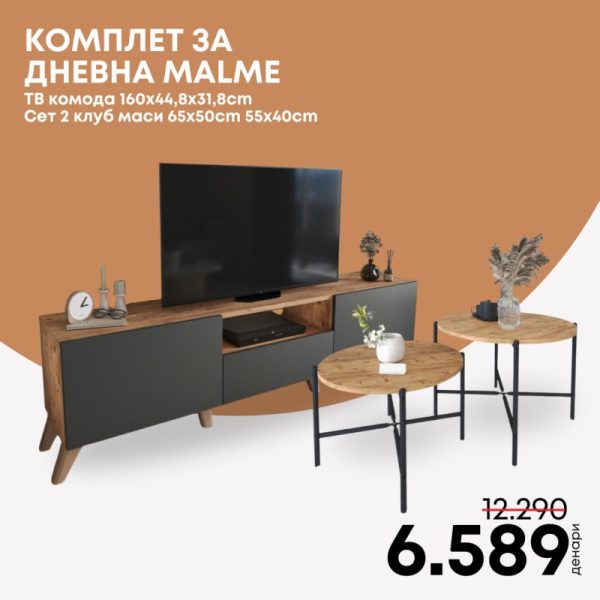 Комплет за дневна соба, составен од ТВ комода изработена од квалитетна иверица со дебелина од 18 mm и две клуб масички со метална конструкција.