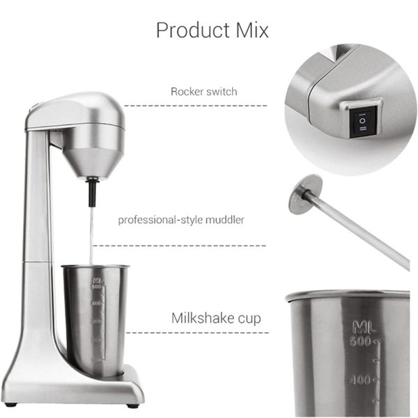 Електричниот апарат за милкшејк може да направи совршени милкшејкови, сладирано млеко, газирани пијалоци и здрави пијалоци, покрај тоа, можете да го користите за матење јајца за правење меки омлети, како и за разни сосови.