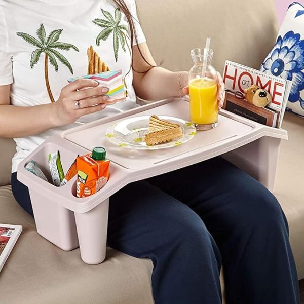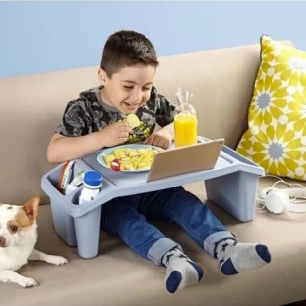 Овој послужавник за кревет има димензии од приближно 58 см x 30 см x 21,5 см (Д x Ш x В). Совршено се вклопува со лаптоп, или можете да го поставите вашиот таблет и телефон во специјално дизајнираниот отвор. Овој послужавник има три дополнителни прегради, еден кружен за вашиот пијалок и два поголеми за книги, лични предмети, слушалки, пенкала, белешки и сè што е потребно да го имате на дофат на рака. Оваа издржлива масичка за кревет е достапна во сина пастелна боја.