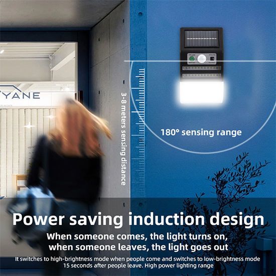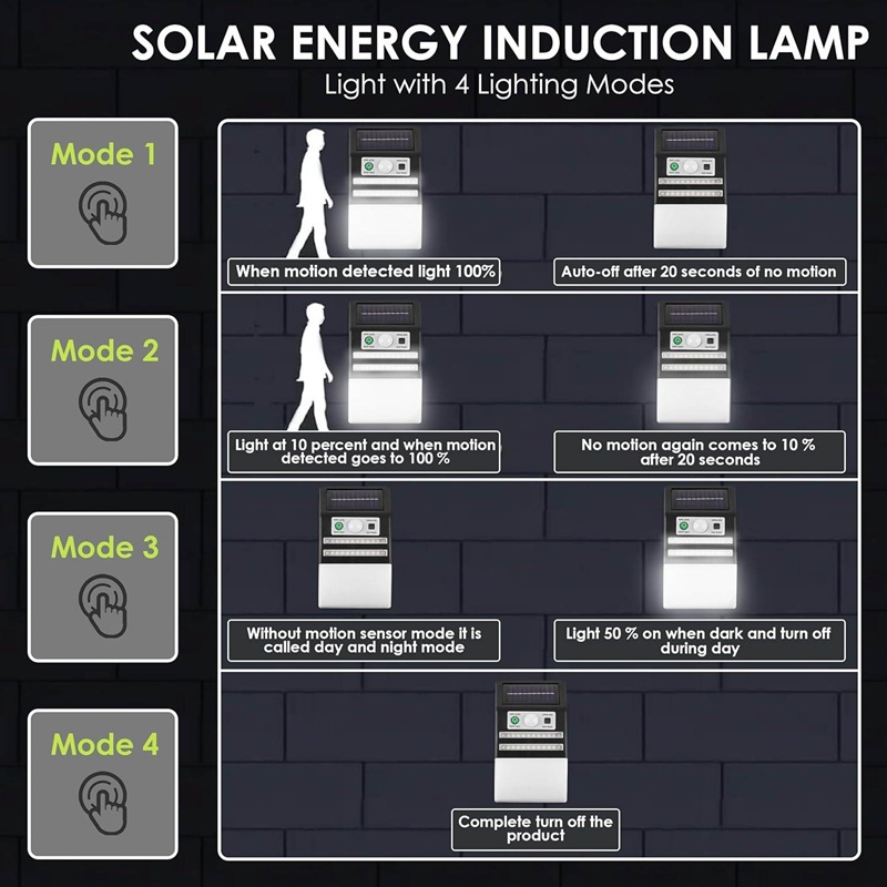 Мултифункционална употреба: LED сончевото улично светло е моќно, има сензори за човечко тело, сензори на светлина, повеќе режими на светлина за да ги задоволат вашите потреби во различни сценарија.