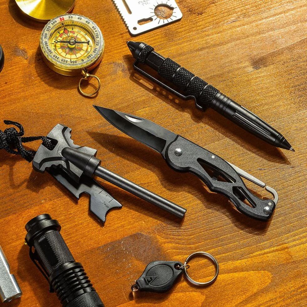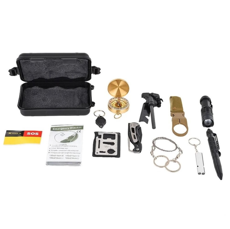 Комплет за преживување – најдобриот комплет алатки за итни случаи 14 парчиња е совршен додаток за секој маж/пријател/истражувач како идеален подарок за секоја пригода. За сите кои се заинтересирани за активности на отворено, или едноставно сакаат да бидат подготвени за какви било неочекувани ситуации. Комплетот е дизајниран да обезбеди сеопфатно решение во итни услови.