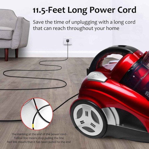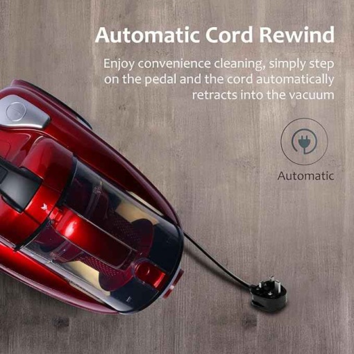 Системот за кабел го собира кабелот внатре во правосмукалката со притискање на копче, без заплакување или дополнителни проблеми. Должината на кабелот е 4м.